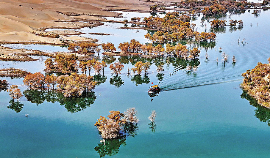 新疆多地胡楊林逐漸進入最佳觀賞期,遊人或可泛舟穿行於胡楊林間,感受大自然的獨特魅力。