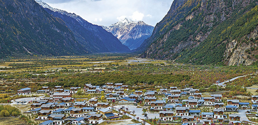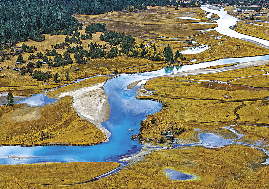 西藏林芝市秋色已濃,黃葉與初雪交織,流水並雪山輝映,景色如詩如畫。