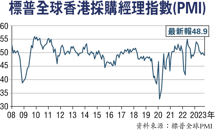 香港文匯報訊(記者 周曉菁)標普全球昨公布的數據顯示,10月香港特區採購經理指數(PMI)經季節調整後,由9月的49.6降至48.9,數值已連續4個月低於50.0持平點,為8月以來連續3個月走低,更是近1年來新低。反映私營經濟景氣再度轉差,惟整體仍算溫和。