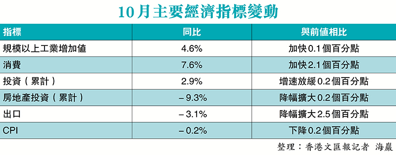 香港文匯報訊(記者 海巖 北京報道)據國家統計局15日最新發布,內地10月經濟持續復甦,工業生產小幅加快,零售額增長好於預期,就業穩定,調查失業率維持低位。國家統計局新聞發言人、總經濟師劉愛華15日在國新辦發布會上表示,隨着宏觀政策效應繼續釋放,需求改善對生產帶動的作用將會進一步增強,產業轉型升級穩步推進,經濟有望延續恢復向好態勢;加之上年四季度基數較低,有利於今年四季度主要經濟指標同比增速回升。