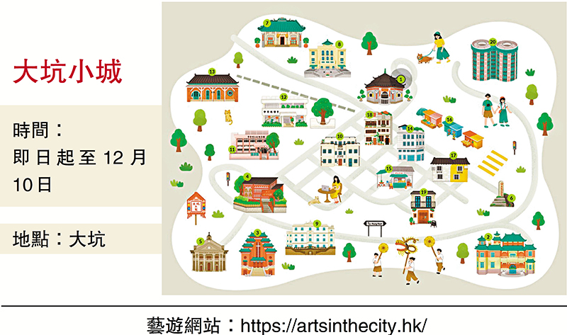 「城中藝遊」日前揭幕的首個項目「大坑小城」,從藝術、建築及歷史角度出發,提供三條藝遊路線,讓公眾可以自助遊歷,或參加不同主題的導賞團探索大坑。在藝遊沿途,可找到超過20件藝術作品,由五位藝術家及團隊(陳庭章、鄭志堅、Hira Hira、蕭俞、杜煥)創作。同時,主辦方亦舉辦了一系列工作坊,供公眾免費參與。