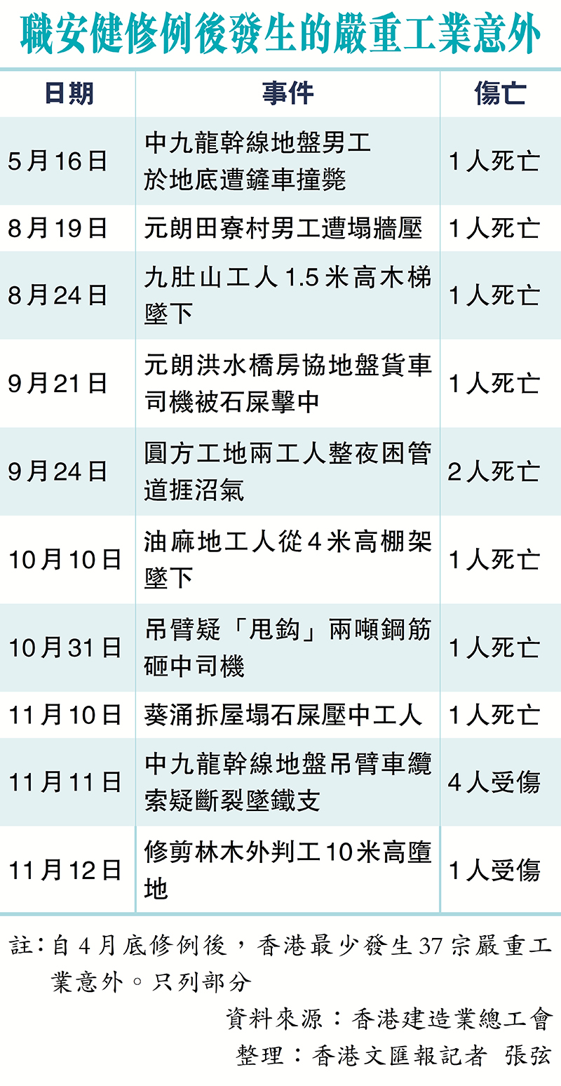 香港的職安健等相關條例於今年4月通過後,罰則大幅提升以加強對僱主的阻嚇作用,但修例後發生的工業意外不跌反升。香港建造業總工會表示,修例至今共發生37宗嚴重工業意外,造成16死26傷,每月平均傷亡人數高於修例前(1月至4月)的5.5人,反映加重罰則的作用有限。就此,工聯職安健協會聯同建造業總工會昨日約見發展局局長甯漢豪,促請改善地盤安全管理,包括要求勞工處重新審視《工廠及工業經營條例》附屬條例及其安全指引,並且參考內地的工程質量安全終身責任制,在施工時已引入安全概念,包括項目日後的維修安全,而相關人等的法律責任終身有效,冀從源頭減少意外發生。 ◆香港文匯報記者 張弦