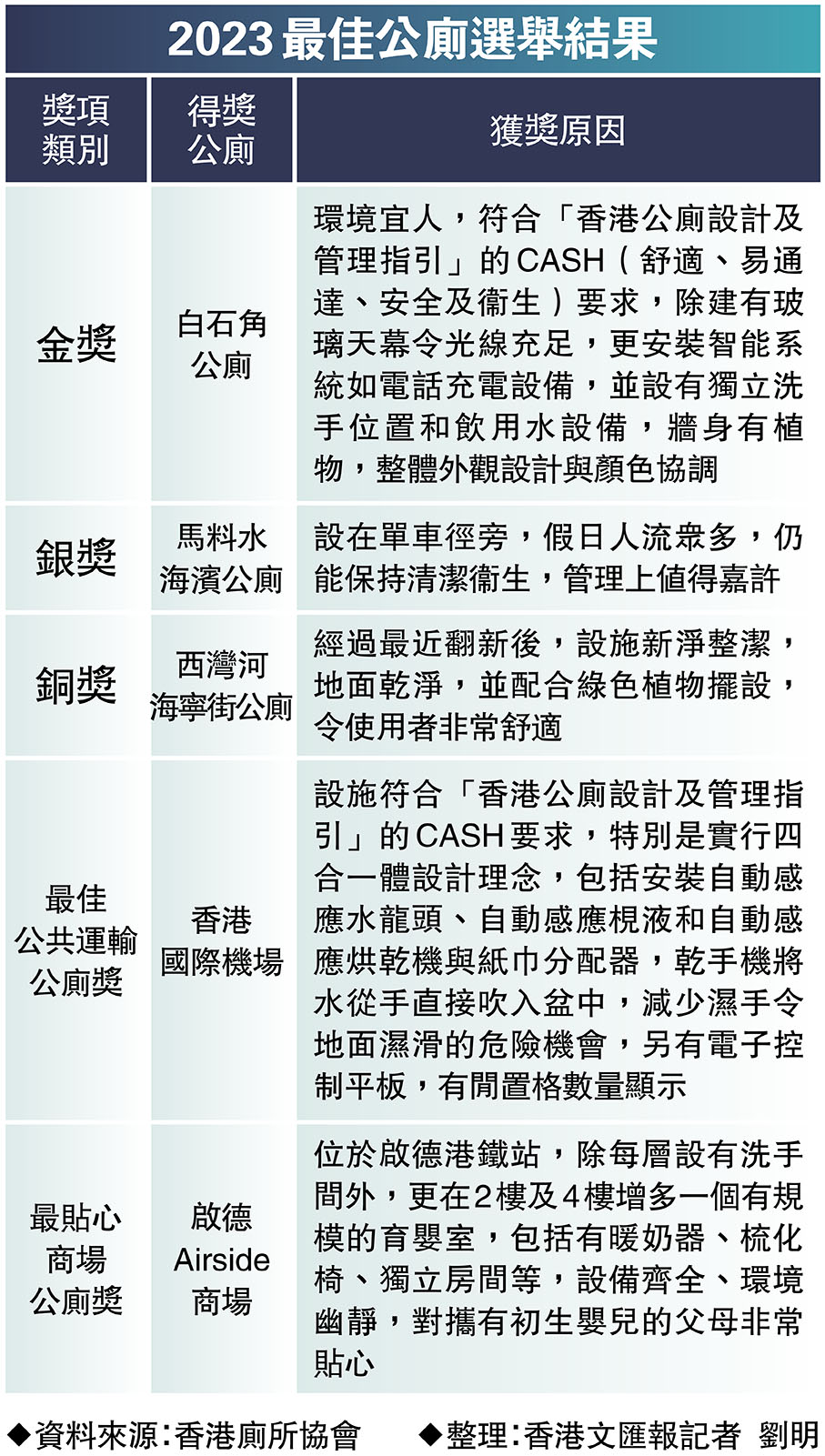 除金、銀、銅獎外,協會還設有最佳公共運輸公廁獎和最貼心商場公廁獎,結果分別由香港國際機場和啟德Airside商場獲得。