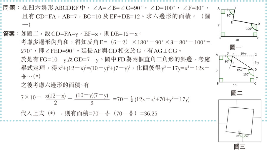 談起巧妙的解法,這題也真是有個很巧妙的做法,一行就做到,就是把圖形用上了「分身術」似的分成四個,像圖三那樣,拼在一起,那個接合處,剛好100˚+80˚=180˚,是直線,於是面積就是一個大正方形減去小正方形之後,再平分四分,也就是¼(17²-12²)=36.25。早前見識到這個解法時,心裏也禁不住一聲喝彩。
