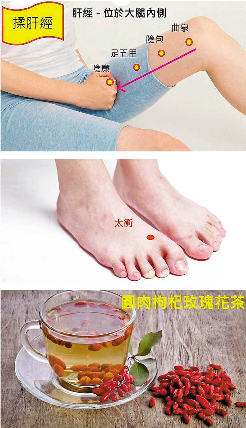 揉肝經步驟:握拳沿大腿內側,由下而上依序按揉壓「曲泉」、「陰包」、「足五里」、「陰廉」等穴位。早晚按壓左右大腿50次。按壓時通常會有微酸微痛感,不可猛力敲打。
