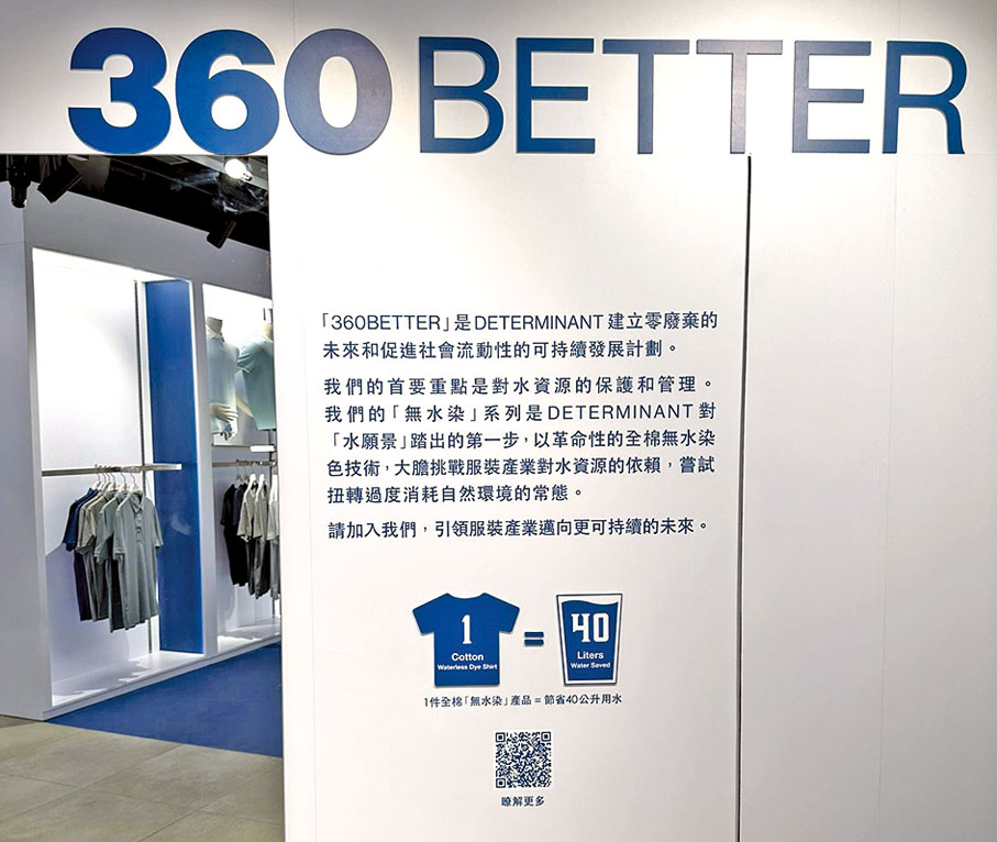 專門店旁邊的產品牆展示DETERMINANT首個「無水染」系列,系列承諾生產過程減少用水,並融入環保概念,同時保持品牌一貫的卓越功能、設計及親民價格。品牌堅信消費者不必就環保選擇承擔「綠色溢價」,因此體現可持續發展概念的全新系列售價與DETERMINANT一般的裇衫、Polo裇和T裇一致。另設高科技零售體驗,客人只需掃瞄RFID碼,便能查看產品資料,更可掃瞄鏡子上的二維碼輕鬆購買產品和結帳。