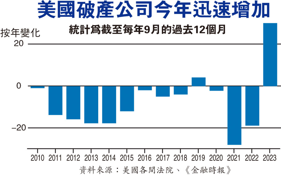 報道引述法院數據顯示,截至今年9月的過去一年間,美國破產企業數目按年增幅高達30%。在歐盟最大經濟體德國,當地從今年1月至9月錄得的破產企業數目,按年增幅達25%,且自6月以來,每月的新增破產企業數目按年增幅都超過10%。歐盟情況也不樂觀,當地今年截至9月的企業破產率按年增幅為13%,是8年來的最高水平。