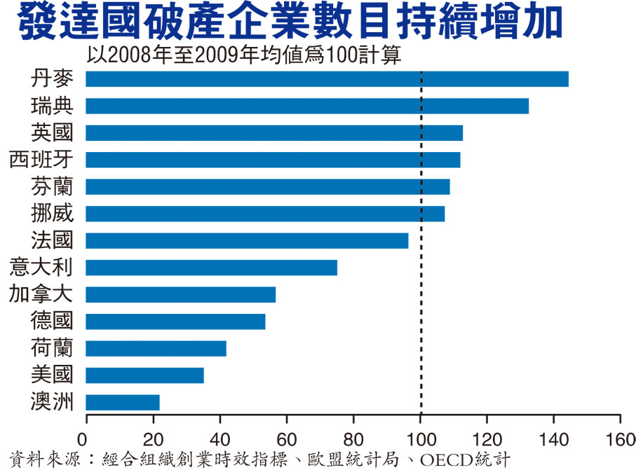 在法國、荷蘭和日本,企業經營狀況也不樂觀,當地統計都顯示截至10月,過去一年內的破產企業數目按年增幅達30%。經濟合作與發展組織(OECD)近期統計還發現,在丹麥和瑞典等福利豐厚的北歐國家,當地企業破產率甚至較2008年金融危機期間更高。