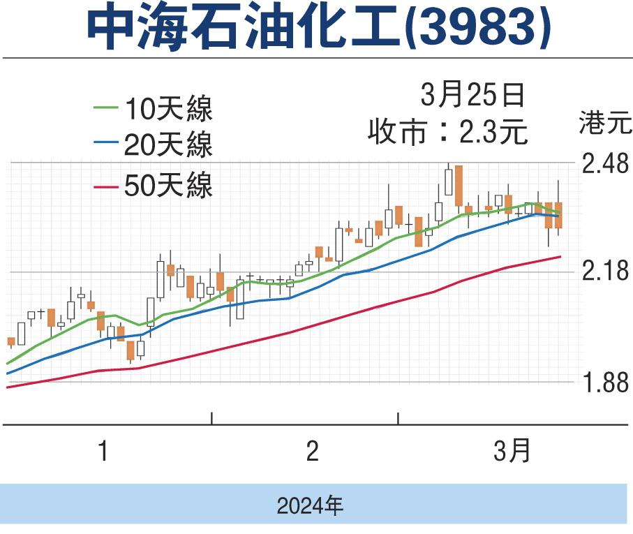 中國海洋石油化學(3983,簡稱中海化學)在昨日偏軟市中靠穩,參與碳製澱粉研究項目獲基金追捧,可收集。中海化學為國企,在港上市18周年,市值41.3信元。主要股東中國海洋石油總公司持股59.41%、MGD持股6.01%、Hermes投資管理持股14.38%。
