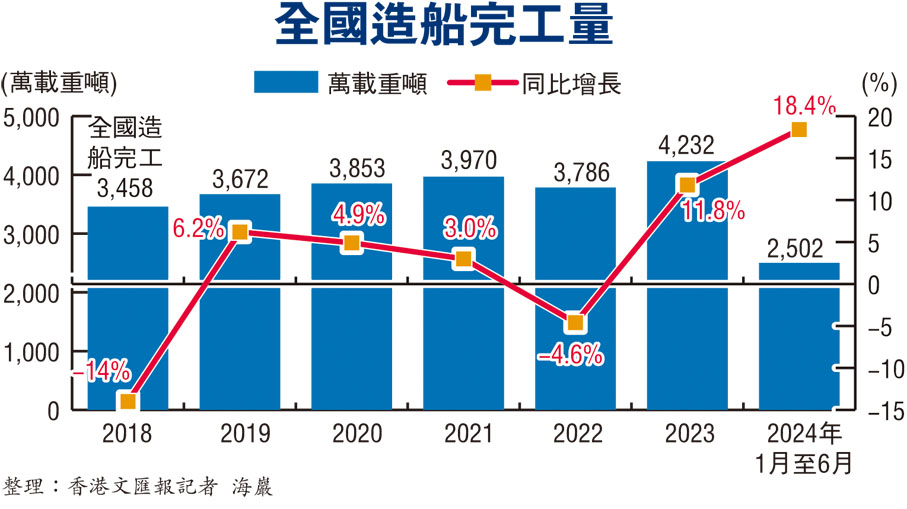 工信部數據顯示,2024年上半年,中國造船完工量2,502萬載重噸,同比增長18.4%;新接訂單量5,422萬載重噸,同比增長43.9%;截至6月底,手持訂單量17,155萬載重噸,同比增長38.6%。上述三大指標分別佔世界市場份額的55%、74.7%和58.9%。在全球18種主要船型中,中國有14種船型新接訂單量位居全球首位。