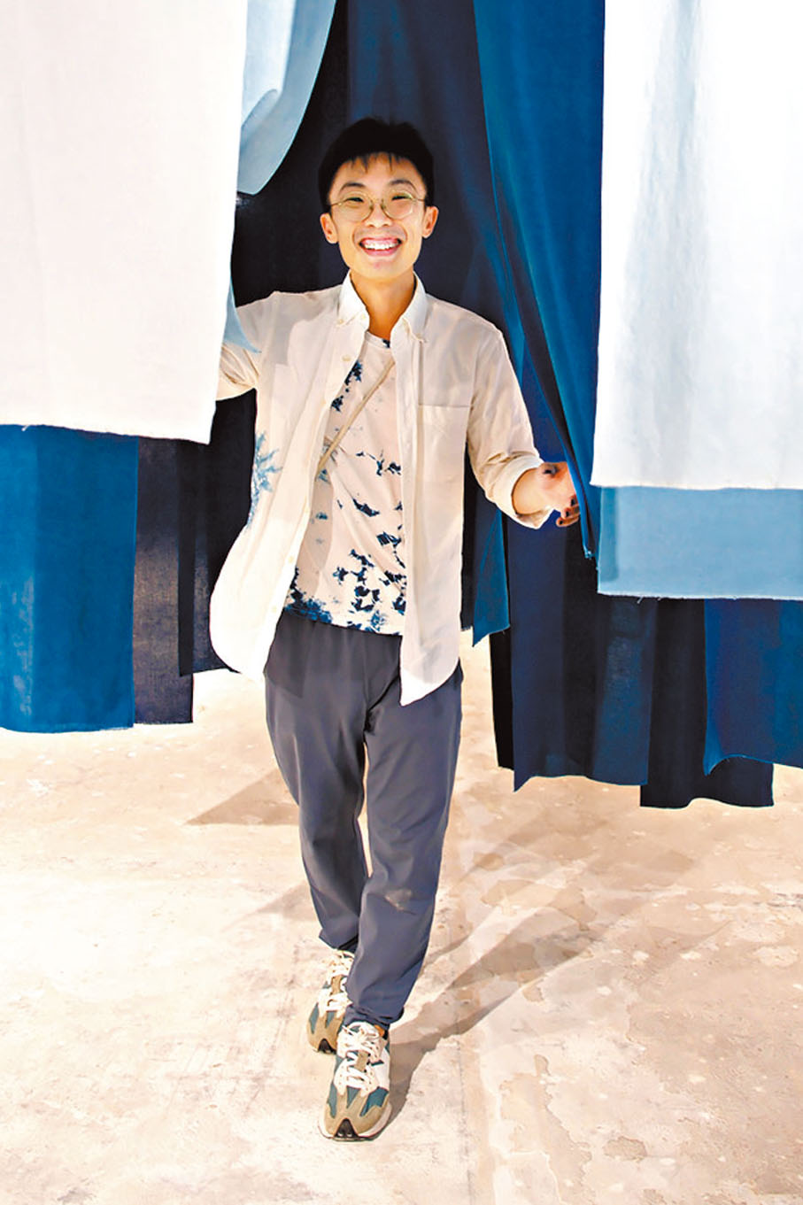 於是,經過反覆調試,Eric染就了16條深淺不一的藍色布料,長度從天花板垂到接近地面,他將其懸掛在展位,並歡迎觀眾走進布料之間,任君拍照或觸摸。
