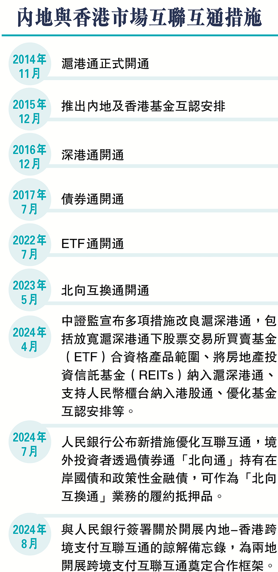 今年以來,中央已公布多項便商利民的惠港措施。金管局總裁余偉文今年6月初表示,金管局與人民銀行在今年初公布「三聯通、三便利」措施,大部分已順利落地,對於有市民期望可進一步優化跨境匯款安排,方便港人在內地「醫」食住行、退休養老等,他便透露正與內地積極探討包括開展內地與香港跨境支付互聯互通。