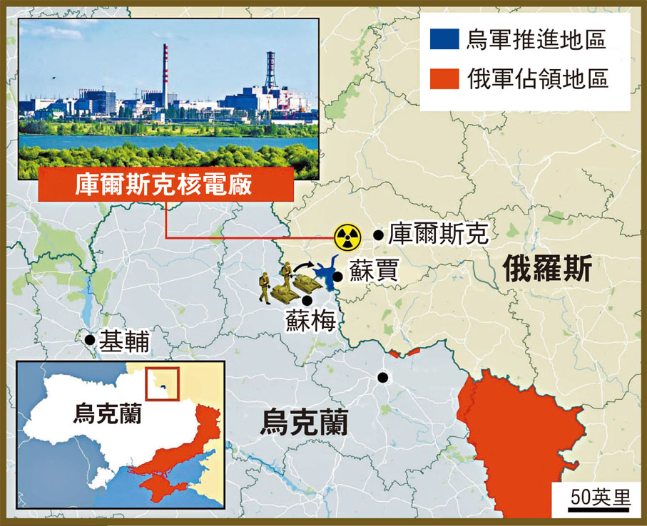 俄國防部還提到,攻擊核電廠將污染周邊大片區域。據路透社報道,烏部隊本月6日攻入庫爾斯克州,並宣稱從那天之後,烏軍已掌控1,150平方公里俄領土,並控制82條村落。 然而庫爾斯克核電廠目前仍處於俄方控制下。