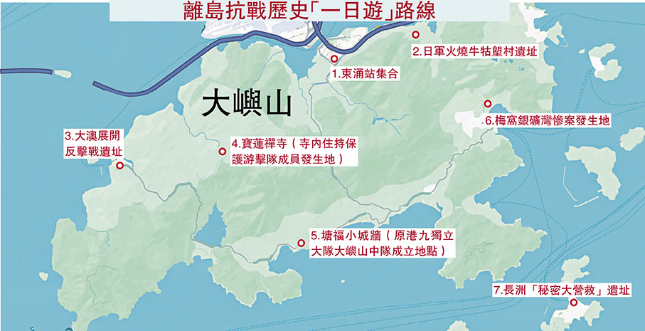 新社聯副理事長兼離島地區委員會主席祝慶台昨日在接受香港文匯報訪問時表示,建議開展「一日遊」路線,從東涌站集合,可經日軍火燒牛牯塱村遺址、大澳展開反擊戰遺址、寶蓮禪寺(寺內住持保護游擊隊成員發生地)、塘福小城牆(大嶼山中隊成立地點)、梅窩銀礦灣慘案發生地、長洲的「秘密大營救」舊址,最後返回市區。