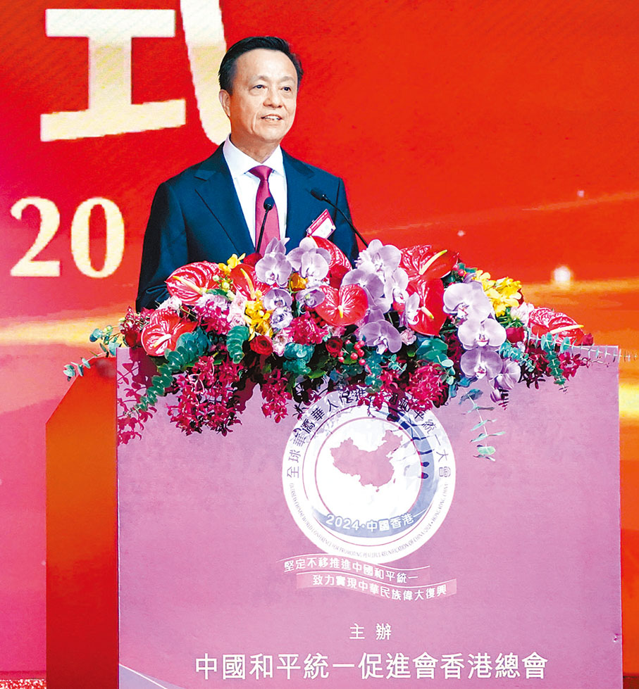 姚志勝昨日在全球華僑華人促進中國和平統一大會(2024·中國香港)上致歡迎辭表示,來自世界各地的統促會組織和愛國僑團代表共聚一堂,在率先實行「一國兩制」的香港,舉行全球華僑華人促進中國和平統一大會,具有特別的意義。