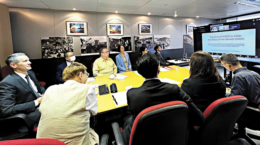 今天(3日)是中國人民抗日戰爭勝利紀念日。俄羅斯聯邦駐港總領事館昨日舉辦圓桌論壇,邀請來自內地、香港、俄羅斯的學者透過網上網下方式,共同討論第二次世界大戰亞洲和太平洋戰場的歷史情況以及對後世的影響。俄羅斯駐港總領事阿納托利·卡爾加波洛夫(圖中左一)出席了論壇。◆香港文匯報記者 康敬