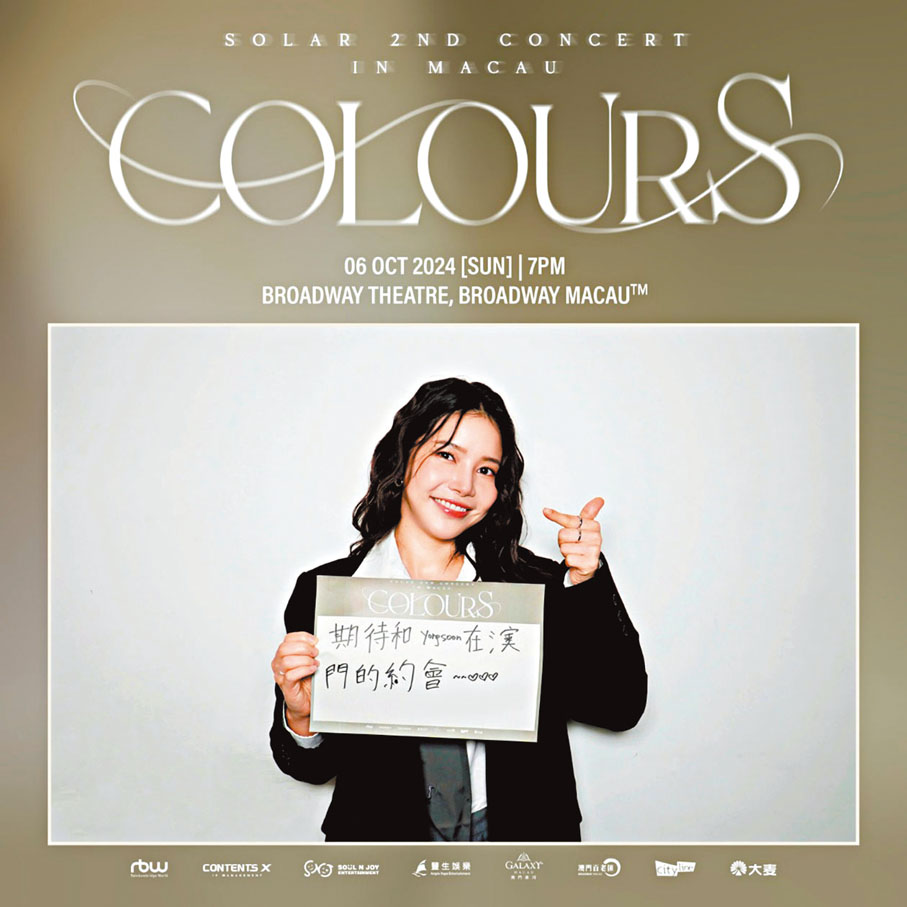 香港文匯報訊 韓國人氣女團MAMAMOO不論團體還是成員的個人活動均大受歡迎,而擔任隊長的頌樂(Solar)就在今年展開了她的個人巡迴演唱會。近日她正式宣布將於10月6日在「澳門百老匯™」—百老匯舞台舉行其首次澳門演唱會《Solar 2nd CONCERT [COLOURS] TOUR IN MACAU》,同時或是這次亞洲巡演的最後一站,因而具有雙重意義!