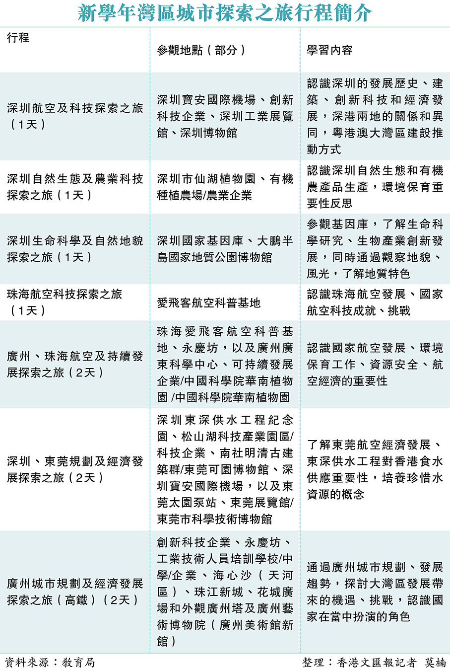 為深化香港學生對大灣區各內地城市的歷史、科技、航空、經濟、城市規劃及自然生態等方面的認識,豐富學習體驗,香港特區政府教育局昨日宣布,在2024/25學年為學生舉辦粵港澳大灣區城市探索之旅的詳情。局方委託承辦機構於2024年10月至2025年8月,籌辦共7個大灣區內地城市的1天至2天行程,供小四至中三學生參加,涉及深圳、珠海、廣州、東莞等地,讓學生了解香港和相關內地城市在大灣區建設中的優勢和發展空間,提升他們的國民身份認同。 ◆香港文匯報記者 莫楠