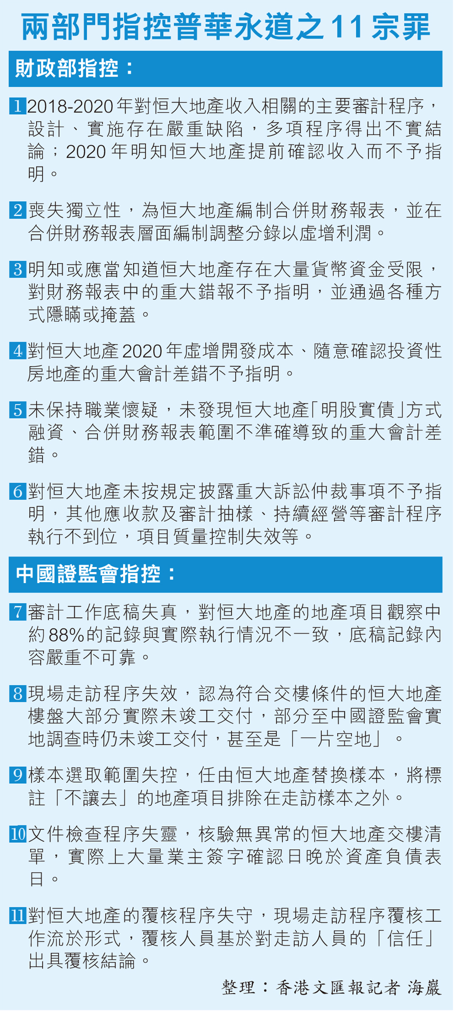 涉及中國恒大財務造假,內地監管部門對普華永道(港稱「羅兵咸永道」)的處罰正式落地。國家財政部和中國證監會昨日開出頂格罰單,顯示普華永道涉及「11宗罪」(見表),對其共罰4.41億元(人民幣,下同),並給予普華永道警告、暫停經營業務6個月,及撤銷承擔直接審計責任的普華永道廣州分所等行政處罰。這是內地監管部門對會計師事務所作出的最嚴厲處罰。普華永道對行政處罰表示尊重並堅決服從,同時採取一系列整改和追責措施,包括辭退涉及恒大地產項目的6名合夥人及5名員工。