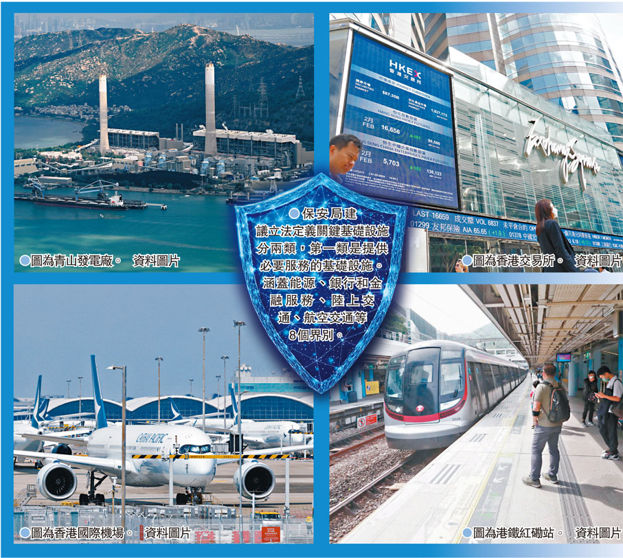 保安局建議立法定義關鍵基礎設施分兩類,第一類是在香港提供必要服務的基礎設施,涵蓋能源、資訊科技、銀行和金融服務、陸上交通、航空交通、海運、醫療保健及通訊和廣播共8個界別,第二類是維持重要的社會與經濟活動的基礎設施,例如大型體育或表演場地、科研園區等。
