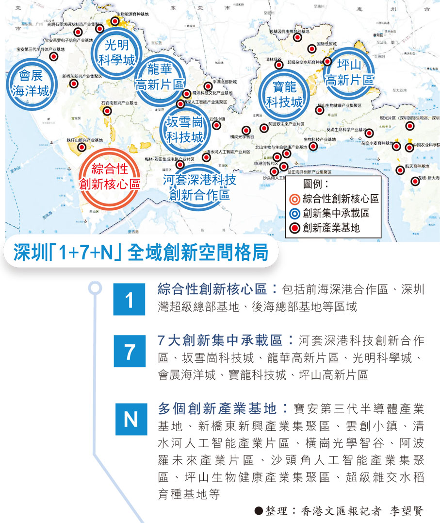 圍繞創新發展,總體規劃提出要將深圳打造成「1+7+N」全域創新空間格局,其中「7」為7大創新集中承載區,包括河套深港科技創新合作區、坂雪崗科技城、光明科學城等。