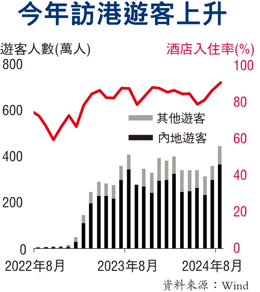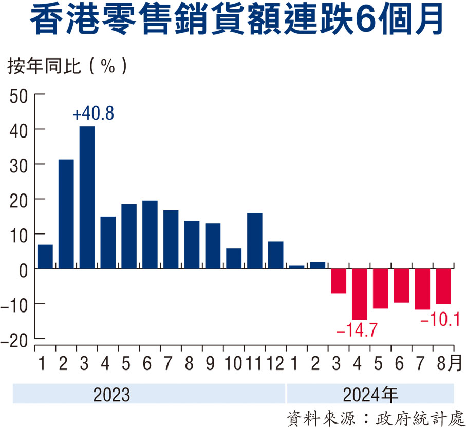 事實上,自今年5月27日起新增了8個個人遊城市,8月1日起,中央又將內地居民旅客自香港進境內地攜帶行李物品的免稅額度由5,000元(人民幣,下同)提高至12,000元,同時保留在進境口岸免稅店額外購買3,000元免稅商品政策的措施,擴展至所有口岸;與此同時,香港今年首8個月共錄得近3,000萬人次旅客,同比大增43.7%。然而,8月份香港零售業總銷貨價值同比仍然下跌10.1%,連跌6個月,首8個月零售業總銷貨價值同比跌7.7%。