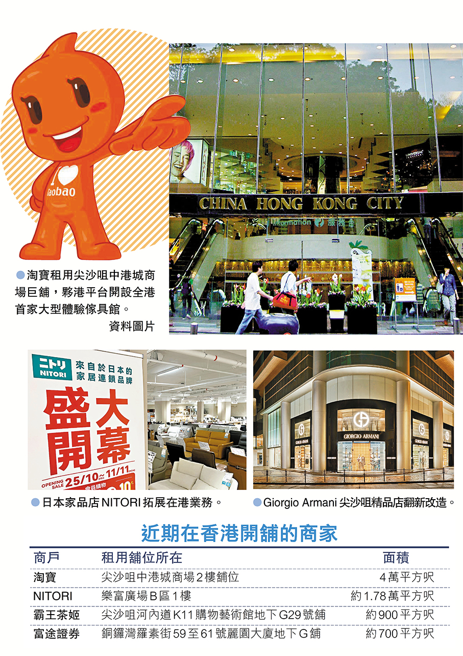 香港復常通關後,旅客來港情況改善,內地及海外商家看好香港的零售業發展前景,近年積極來香港開店或拓展業務。市場消息指,阿里巴巴旗下電商平台淘寶租用尖沙咀中港城商場4萬平方呎巨舖,將夥拍香港平台,開設全港首家大型傢具體驗館,市場人士估計,月租涉約50萬元。另外日本家品店NITORI亦擴充香港業務,旗下面積1.78萬平方呎的樂富廣場分店昨日正式開業。 ●香港文匯報記者 梁悅琴