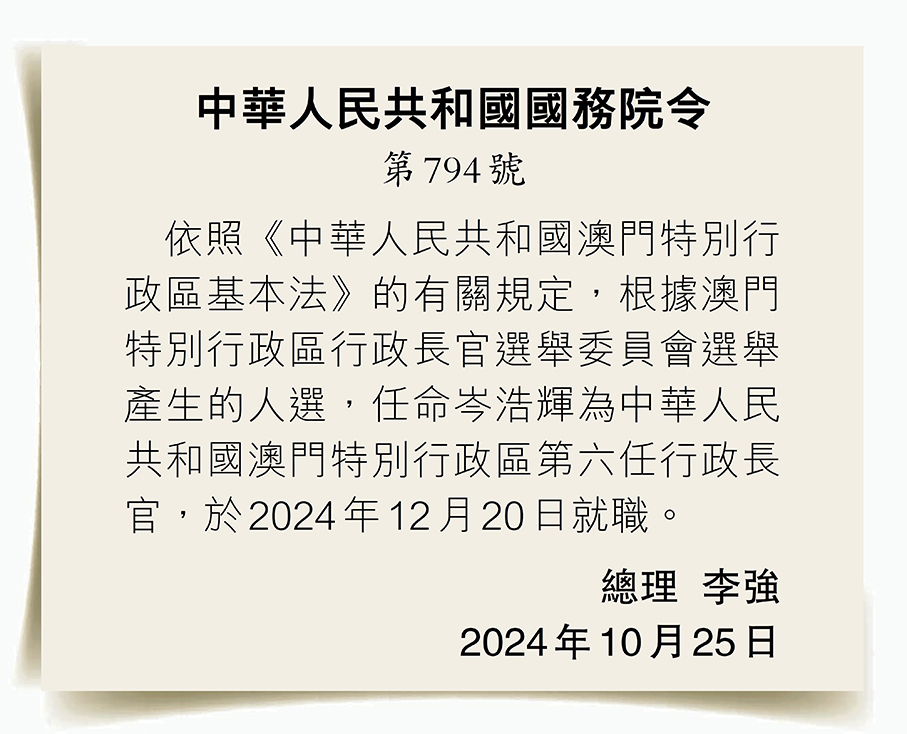 香港文匯報訊 據新華社報道,國務院總理李強10月25日主持召開國務院第六次全體會議,決定任命岑浩輝為澳門特別行政區第六任行政長官,於2024年12月20日就職。
