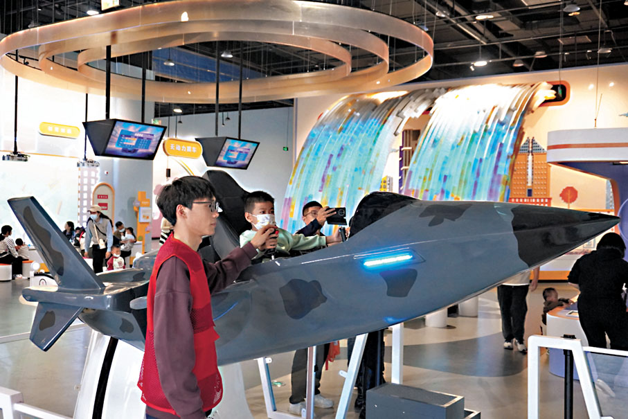 10月29日,河南鄭州,鄭州科技館新館開館試運行,吸引眾多市民打卡嘗鮮,感受科技的奧秘。該館總建築面積7.9萬平方米,包含「輪子上的世界」等11個主題常設展廳,全館600餘件(套)展品,可互動體驗的達90%以上。通過裸眼3D、虛擬現實、全息成影等技術讓觀眾沉浸式感受科技的魅力。圖為小朋友體驗「小小飛行員」裝置。 ●文/圖:中新社