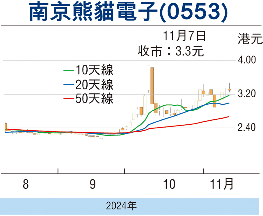 熊貓電子昨收報3.30元(港元,下同),升2仙或0.63,成交2,150萬元。該股自10月初高位3.88元回落至2.66元獲承接反彈,現價市賬率0.83倍,股價企於多條平均線之上。集團財政穩健,業續來年扭虧前景看好,可伺機吸納,上望3.80元,跌穿3元止蝕。