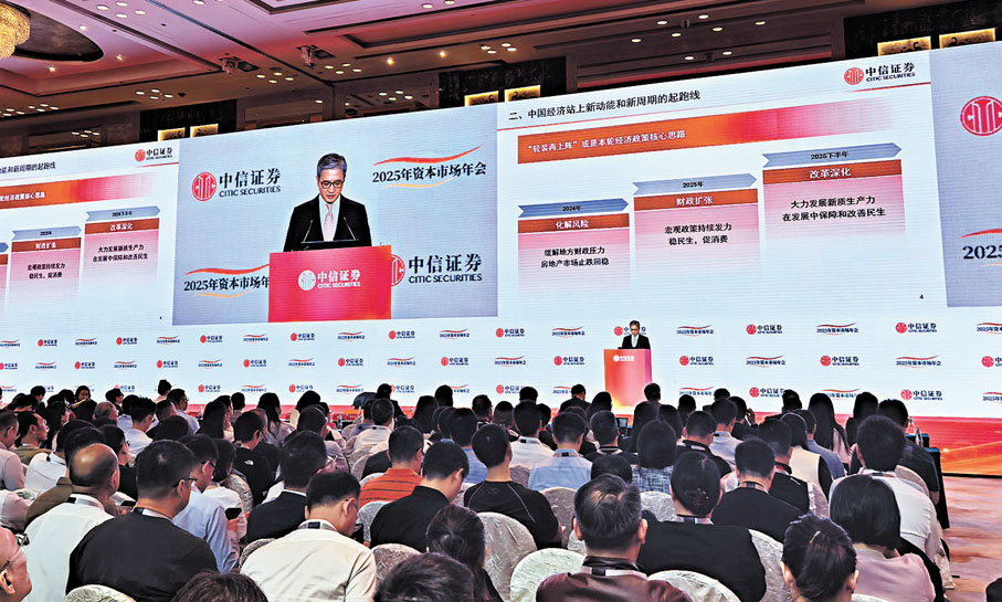 香港文匯報訊(記者 李望賢 深圳報道)中信証券2025年資本市場年會昨日在深圳開幕,中信証券總經理鄒迎光表示,國際地緣形勢、中國宏觀經濟、資本市場生態都進入了全新的階段,全球政經形勢仍然複雜多變,但中國的國際話語權和主動權已明顯增強。展望2025年,中國新舊動能轉換成效顯著,並且在一系列增量宏觀政策助力下,中國經濟有望扭轉下行趨勢,站上新動能和新周期的起跑線。內地的信用周期、宏觀價格、A股盈利都將迎來周期上行的新起點。
