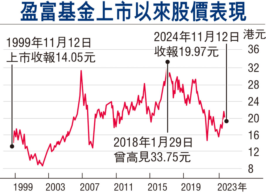 盈富基金昨收報19.97元,跌2.87%。翻查資料,盈富基金在上市時發行規模333億元,當年特區政府以折讓價每基金單位12.88元向散戶出售基金單位,上市25年來累計派息每基金單位達16.08元,按昨收市價19.97元計,總回報達約180%。