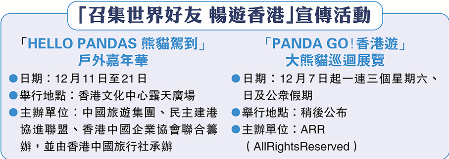 為帶動全城喜迎大熊貓的歡樂氣氛,文體旅局同日宣布將與社會各界及旅遊業界合作,以「召集世界好友 暢遊香港」為主題的一系列宣傳活動(見表)。