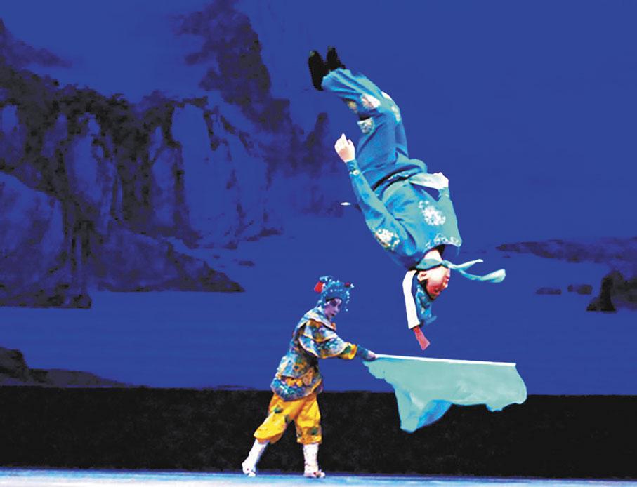 日前,藝青雲粵劇團重演《藝海浮生》一劇,其中有一場便是文武生藝青雲與武師合作的耍大旗/觔斗大戲,武師矯健身手與藝青雲嫺熟的耍大旗演繹,現場喝彩聲不斷。 ●文︰白若華