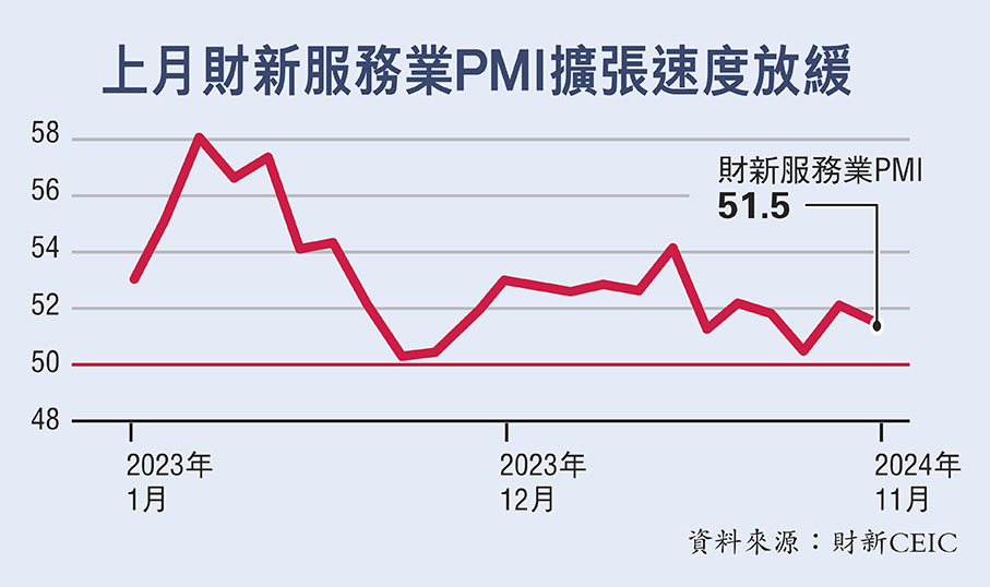 財新中國11月服務業採購經理指數(PMI)回落至51.5,較10月回落0.5個百分點,市場原先預期升至52.4。數據反映內地服務業仍在擴張,但擴張步伐輕微減慢。至於11月財新中國綜合PMI則反彈0.4個百分點至52.3,創5個月新高。 ●香港文匯報記者 岑健樂