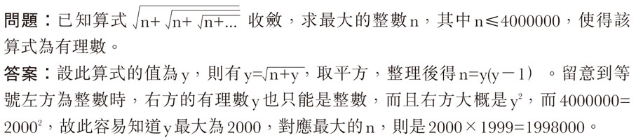 題解裏先把收斂的值設為y,而由於根號內,y的形式重複出現,於是就成了另一個y。留意到取n為主項,則可試出y最大為多少。當中有個小步驟,也可以留意一下,為什麼n=y(y-1)時,右方的有理數y也必然是整數?有興趣的讀者可以想想。
