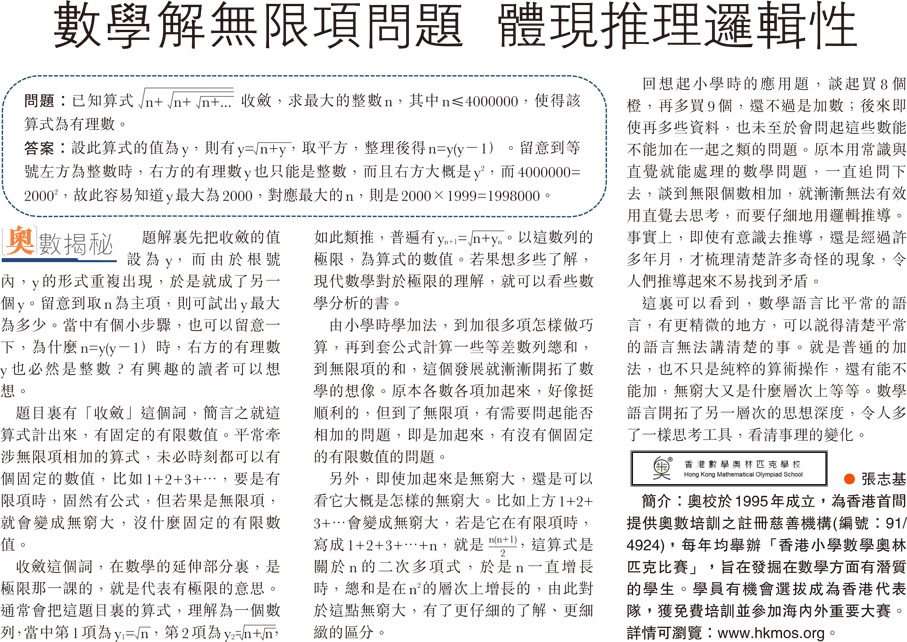 簡介:奧校於1995年成立,為香港首間提供奧數培訓之註冊慈善機構(編號:91/4924),每年均舉辦「香港小學數學奧林匹克比賽」,旨在發掘在數學方面有潛質的學生。學員有機會選拔成為香港代表隊,獲免費培訓並參加海內外重要大賽。詳情可瀏覽:www.hkmos.org。