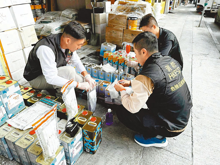 警方跨部門反恐專責組(反恐專責組)聯同消防處危險品執法課人員,前日下午約2時突擊巡查旺角區內多間五金及化工原料零售店舖。其間,人員在一間五金舖內檢獲約490升第三類危險品,負責人涉嫌違反《危險品條例》將被檢控。同時,人員亦向多名店舖負責人講解可疑化學品特徵,鼓勵業界見疑即報。