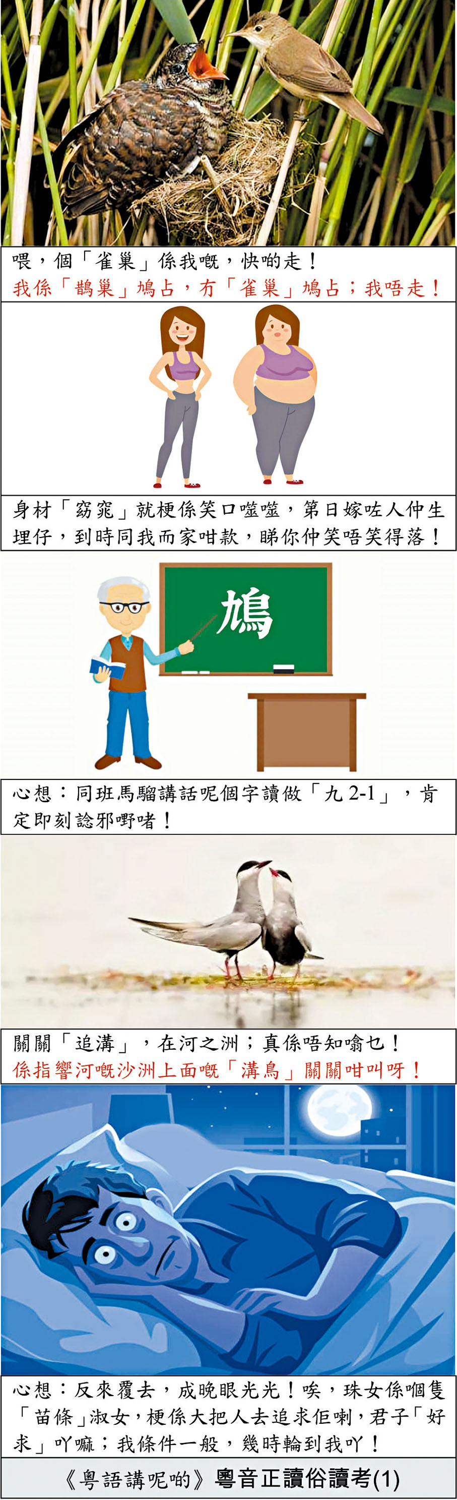 翻查粵音字典,「鵲」「鳩」的「正讀」分別是「卓」「九2-1」。換句話說,老師有教錯學生之嫌。筆者曾與一些資深中文老師討論過以上課題。有老師表示把「鳩」讀成「溝」帶故意成分——「鳩」的「正讀」與陽具的廣東話粗口音同,讀作「溝」是避免學生不必要的聯想和借「音」發揮;至於把「鵲」讀成「雀」是因為實在太多人(幾乎所有人)這樣讀。