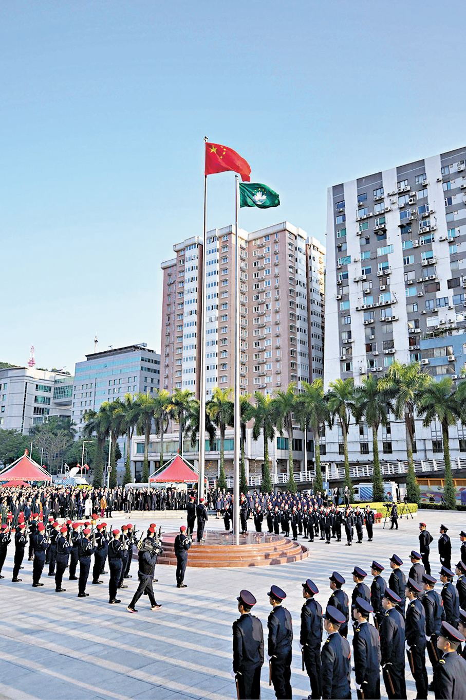 澳門特別行政區第六任行政長官岑浩輝、中央政府駐澳門聯絡辦公室主任鄭新聰、外交部駐澳門特派員公署特派員劉顯法、中國人民解放軍駐澳門部隊司令員于長江,及特別行政區政府主要官員,與澳門各界人士一同觀禮。 ●圖:新華社