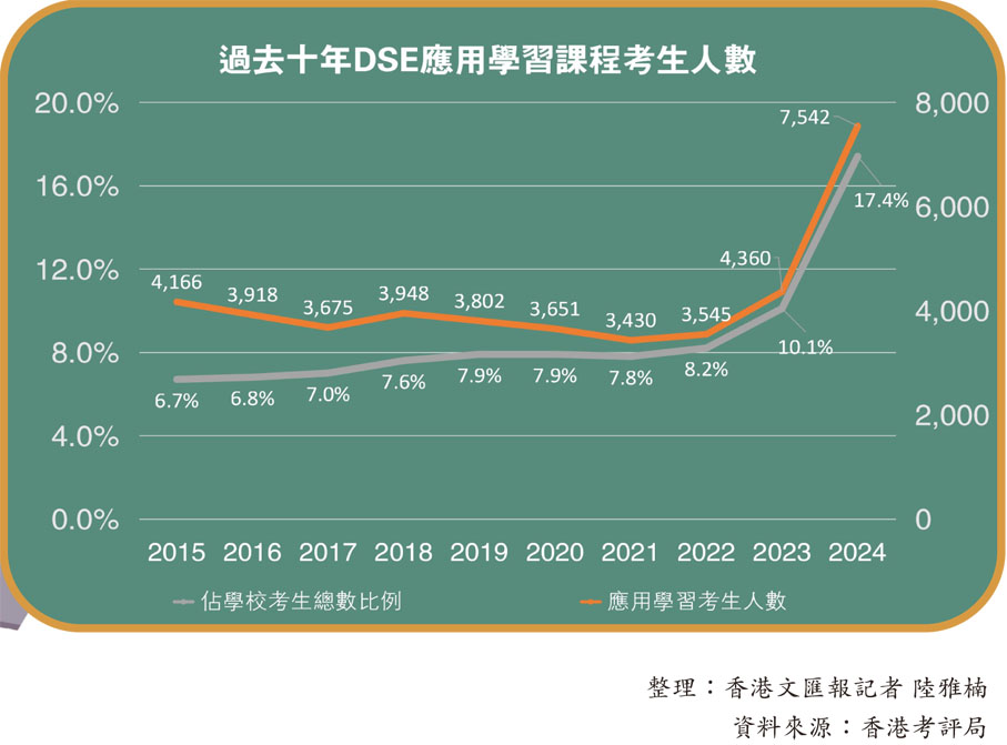 不過,與傳統選修科相比,由於應用學習科目只修讀兩年,課時較少,且其最高成績只等同DSE其他科目的4級,在升學層面處於一定劣勢,過去多年來選修比率只處於7%至8%的偏低水平;至今年DSE核心科完成優化,釋出更多學習空間,吸引選修應用學習的學生大增逾3,000名,人數及比率均較以往多逾一倍。