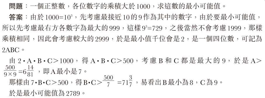 開始解題時若果未有想法也可以先舉例,找幾個各數字乘積大於1000的數,然後找當中最小的,再觀察規律。未必一開始就可以想到找9字相關的數,舉例、試驗、改良、歸納經驗、找尋規律,也是常見的解難過程,平常書裏的題解,多數沒寫出來。