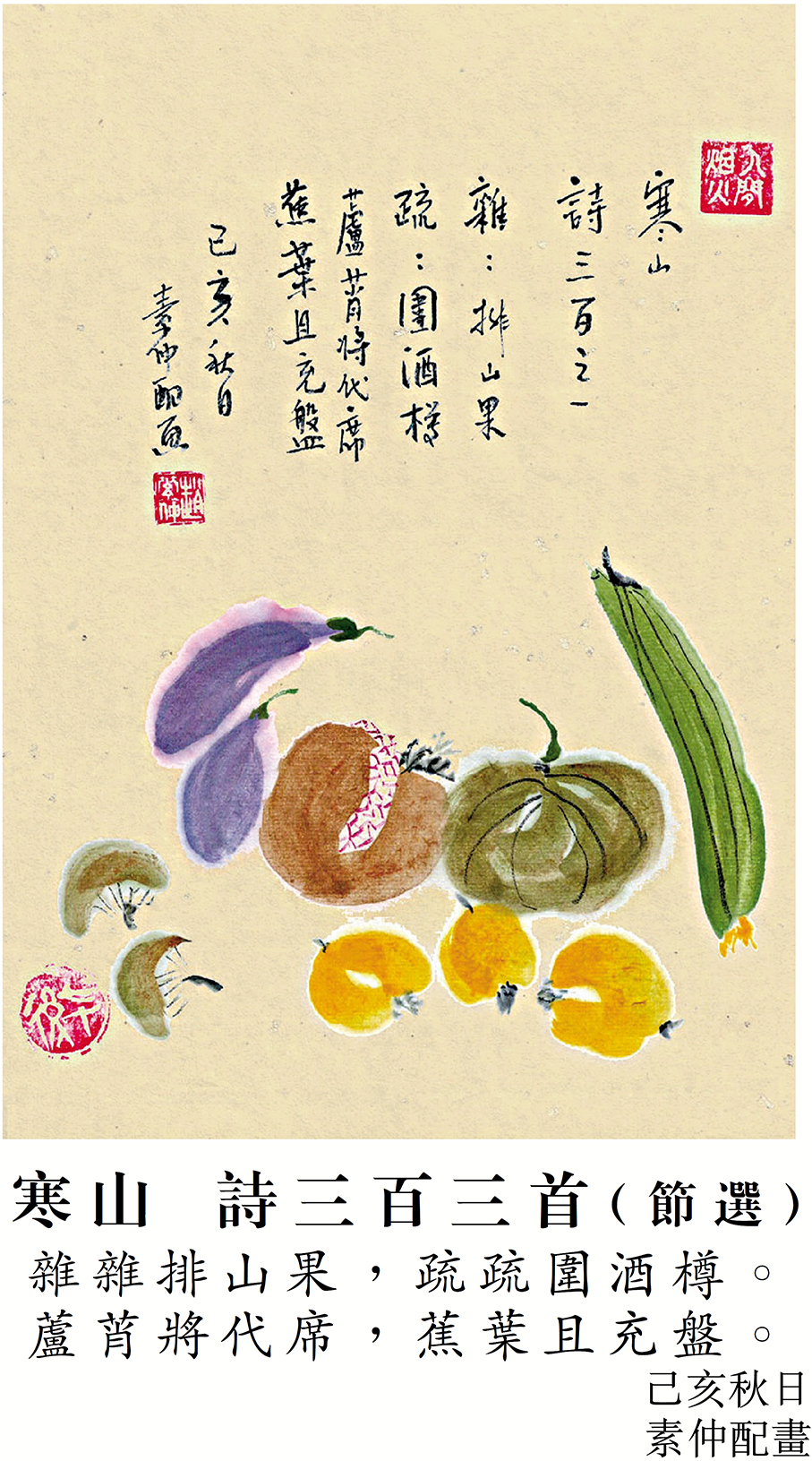 寒山是僧人,吃的是蔬果,詩中描寫了僧人於山中生活的簡樸,叢生的蘆葦代替席,蕉葉擺在盤上,連同許多的山果,就這樣「田家避暑月」地生活。詩中一句「雜雜排山果」,正是今日我們所說的「什果盤」,酒席一般作為單尾奉送。「什果盤」一般內有木瓜、西瓜、楊桃等時令水果。我最愛吃「什果杯」,早餐或午餐後都愛切數種水果,放入大杯內,以叉子慢慢享受,是健康飲食中的最佳選擇。現在提倡一種飲食方法是每日最少五份蔬果。而素食中又有一種是選擇果食的。