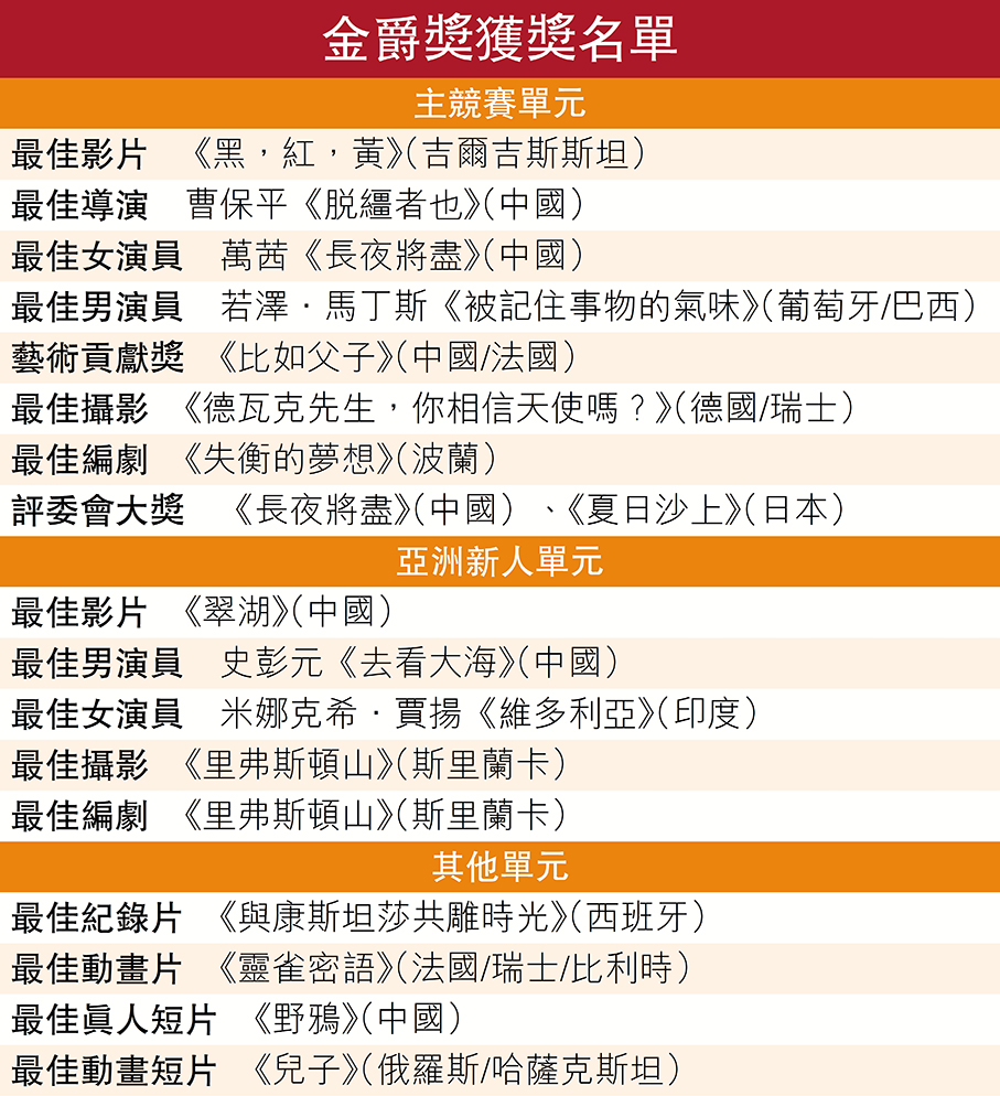 香港文匯報訊(記者 張帆)第二十七屆上海國際電影節(簡稱 上影節)昨晚圓滿落幕。中國電影人在本屆上影節表現亮眼,中國女星萬茜憑《長夜將盡》斬獲金爵獎主競賽單元最佳女演員,中國導演曹保平憑《脫繮者也》再獲得最佳導演。《長夜將盡》還獲得了評委會大獎,亞洲新人獎最佳男演員、最佳影片等亦被中國影人收入囊中。葡萄牙老戲骨若澤·馬丁斯憑《被記住事物的氣味》贏得主競賽單元最佳男主角。吉爾吉斯斯坦影片《黑,紅,黃》獲得最佳影片獎。