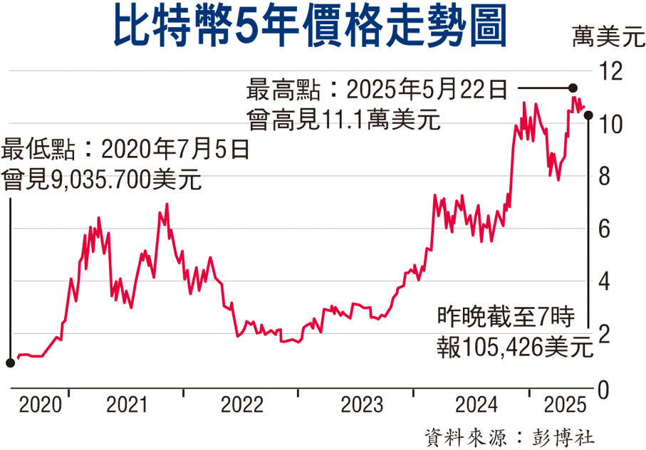 比特幣等數字資產近年受到監管機構認可、ETF產品上市、支付場景深化、通脹與避險需求等等多重利好,大部分的加密貨幣屢創新高,當中比特幣一馬當先,自2020年中突破1萬美元後,就反覆向上,昨晚截至7時,報105,426美元。