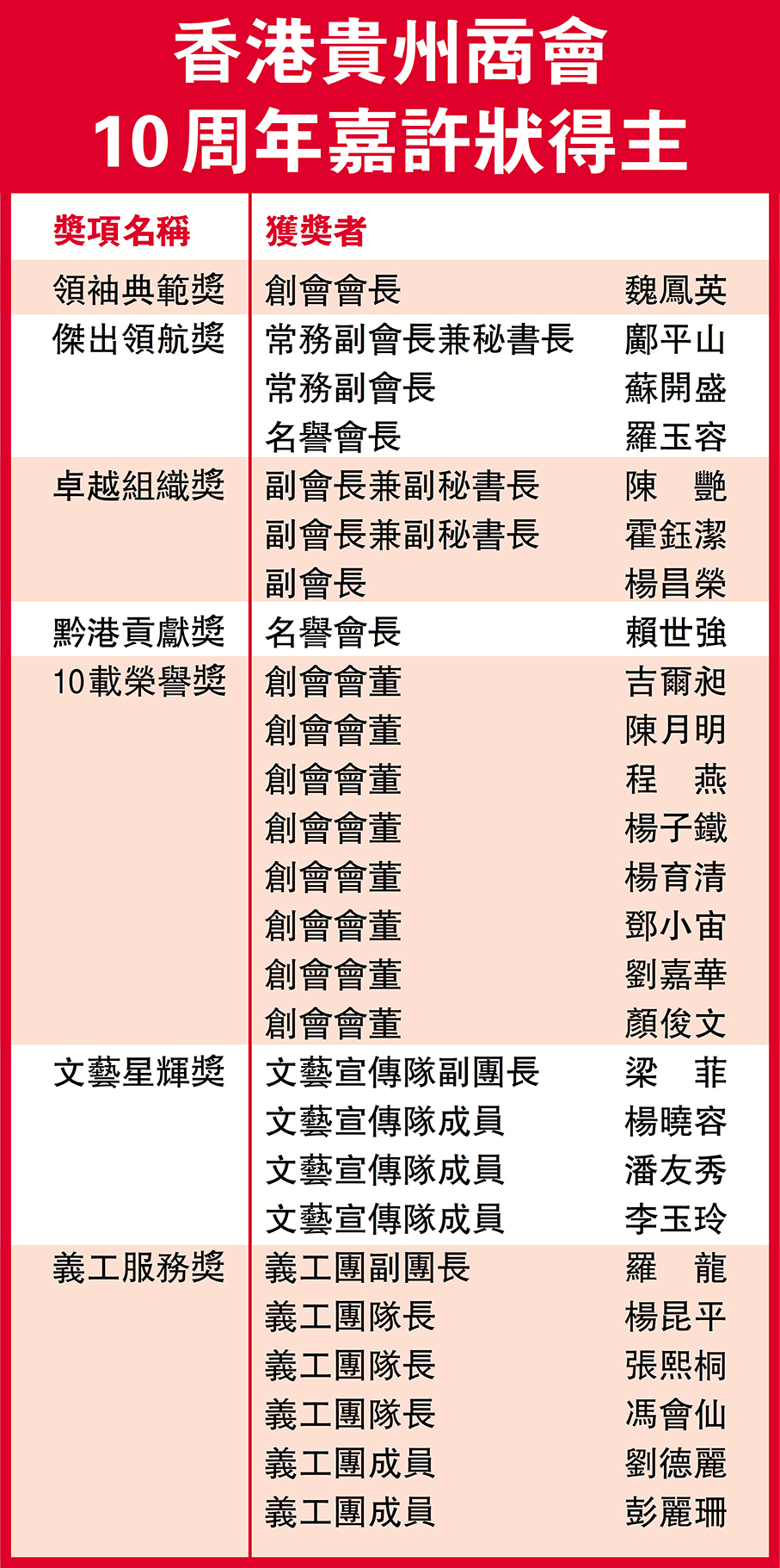 典禮上又頒發10周年嘉許狀,表揚多位為商會作出無私貢獻的成員。最高榮譽的領袖典範獎授予創會會長魏鳳英,感謝她創辦了香港貴州商會,十年如一日的默默耕耘與無私奉獻,為商會發展奠定堅實基石。商會更特別準備了一枚金鳳凰送給魏創會會長,寓意鳳凰展翅,帶領商會騰飛。