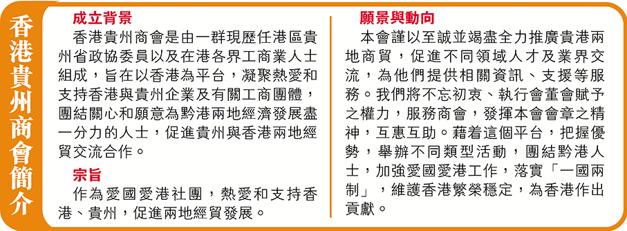 香港貴州商會於6月28日舉行的「慶祝香港特別行政區回歸祖國28周年暨香港貴州商會成立10周年晚宴」圓滿結束。晚會邀得香港特別行政區政府商務及經濟發展局副局長陳百里及貴州省委統戰部副部長徐佑剛出席主禮並致辭,聯同中央政府駐港聯絡辦社團聯絡部部長蘇玉軍,協調部部長朱文,九龍工作部副部長郭長勇,全國政協常委、中國和平統一促進會香港總會會長姚志勝,與全場近400位來自貴州和香港工商界領袖及友好社團代表一起,共慶香港回歸祖國28周年,同賀商會成立10周年,嘉賓冠蓋雲集,場面熱鬧。