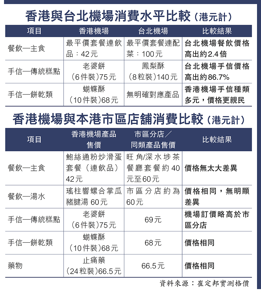 事實又是否如此?香港文匯報記者邀請正往台北公幹的「旅遊達人」崔定邦實測,比較香港機場貨品售價與本港其他區同類產品的售價,以及比較香港機場與台北機場的物價。他首先直擊香港國際機場的餐飲區,到一家連鎖茶餐廳,點選最便宜一個餐(鮑絲通粉炒滑蛋套餐),連飲品僅售42元。他表示:「這些價錢,跟旺角、深水埗的茶餐廳差不多,根本沒有太大分別,比市區價格保障機制下的四區更是平民價。」此外,他還留意到其他餐飲選項,例如五香肉丁湯米粉加炒蛋套餐,價格同樣是42港元,性價比極高,與市區相若。
