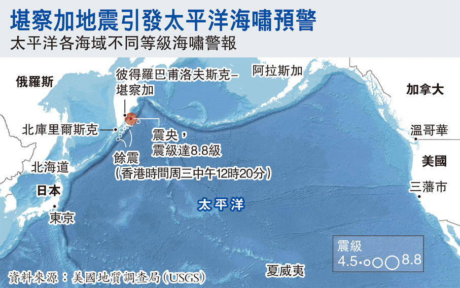 香港文匯報訊 俄羅斯遠東堪察加半島附近海域周三(7月30日)發生黎克特制8.8級強烈地震,是全球有紀錄以來第六強烈的地震,也是全球自2011年日本「311」大地震以來錄得最強烈的地震。地震引發大規模海嘯,俄羅斯、日本、美國與拉丁美洲多國等環太平洋沿岸國家,周三均先後發布海嘯警報。地質學家指餘震預計會持續至少一個月,呼籲各地民眾留意避災。