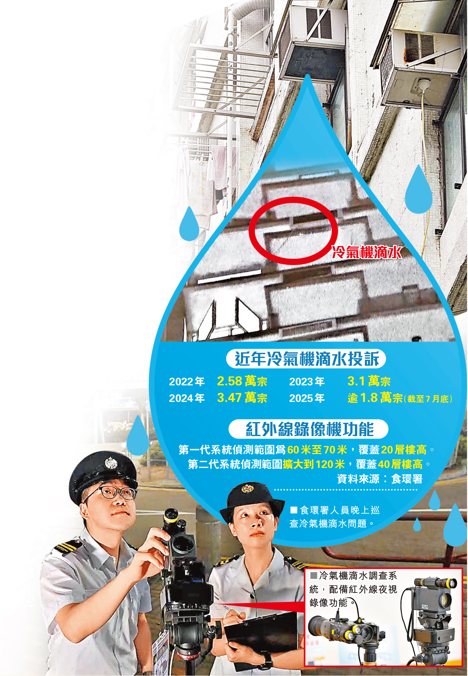 香港冷氣機滴水問題愈趨頻繁,食物環境衞生署近年接獲有關冷氣機滴水的投訴呈上升趨勢,由2022年的2.58萬宗增至去年3.47萬宗,今年截至上月底則錄得逾1.8萬宗投訴。為加強打擊滴水問題,食環署採取全新執法行動,在全港各區配備第一代和第二代紅外線夜視錄像機的「冷氣機滴水調查系統」,以縮短調查取證時間和解決夜間調查難度,以及主動「洗樓」形式打擊各區約300個重點跟進的地點,今年已累計處理約5,200部冷氣機的滴水問題。